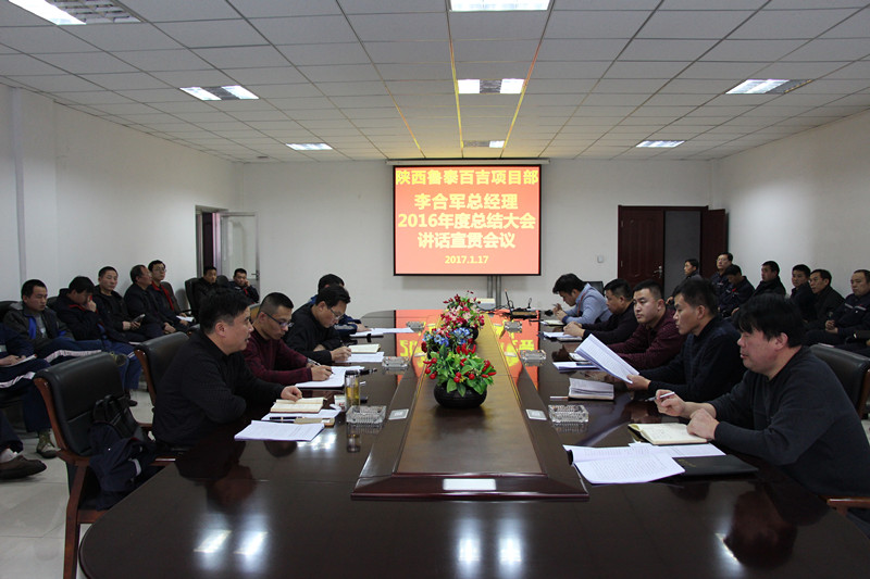 1月17日下午,陕西鲁泰公司在百吉项目部召开专题会议,传达贯彻李合军总经理在2016年度总结表彰大会上《深化改革创新,聚力提质增效,为建设"绿色、创新、卓越、幸福"的新鲁泰而努力奋斗"》的讲话精神,项目部部室、区队班组长以上管理人员和部分职工共计50余人参加。