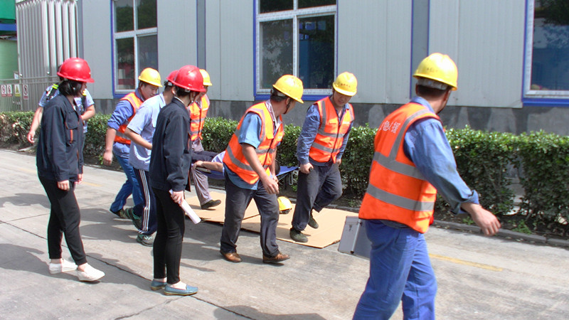 当日15时,演练开始。演练模拟1#氨水罐排污阀损坏大量泄漏氨水,现场值班人员发生中毒呕吐,险情严重。周围运行人员发现险情,紧急佩戴正压式呼吸器立即将中毒人员抱离现场逃离至安全区,并立即汇报上级。