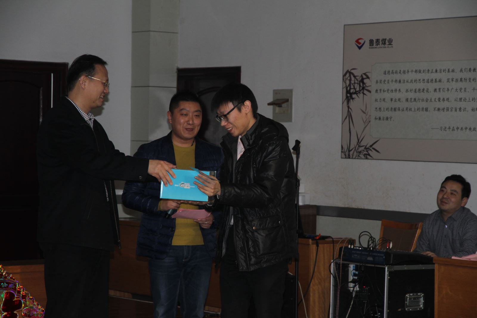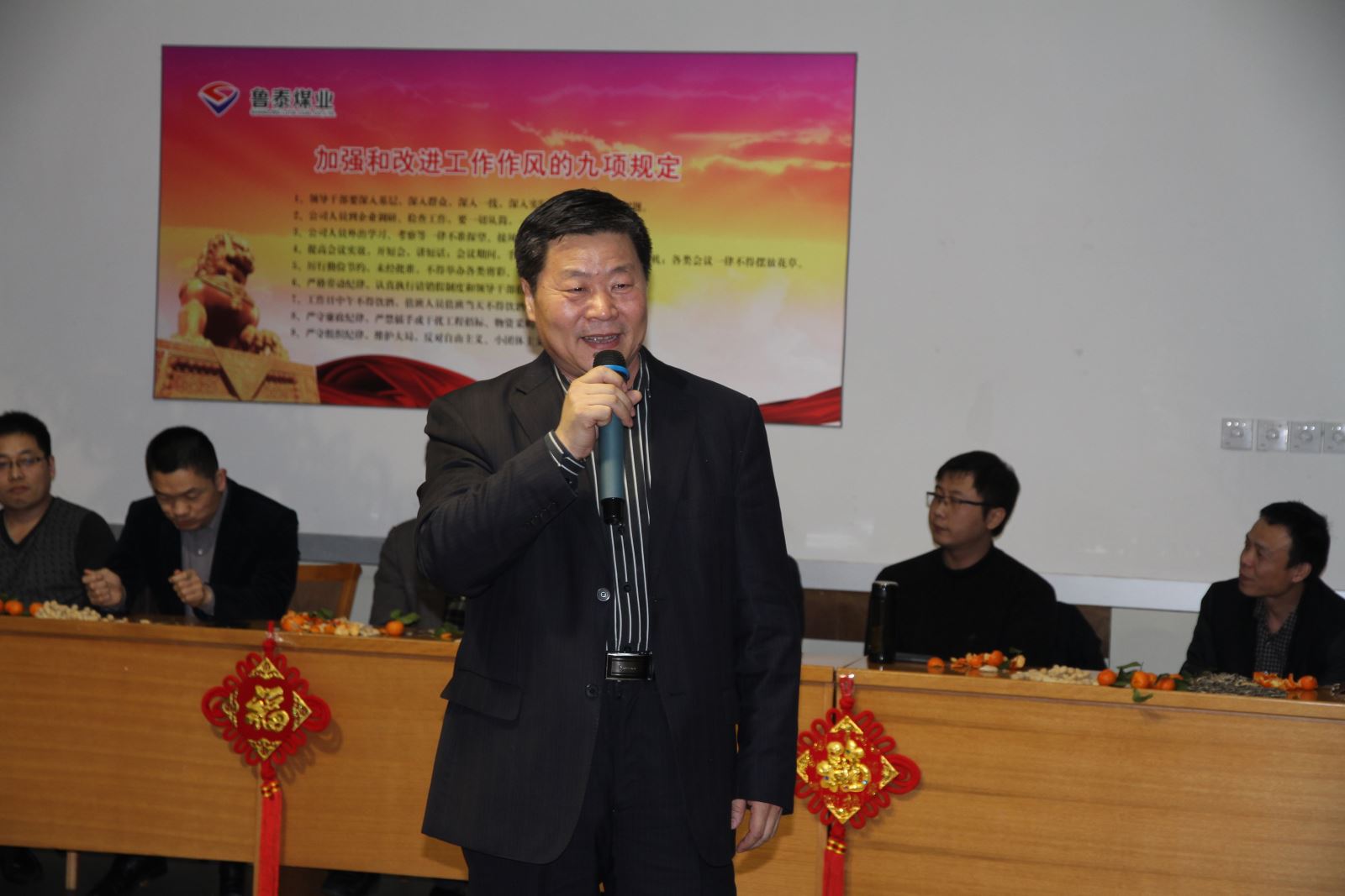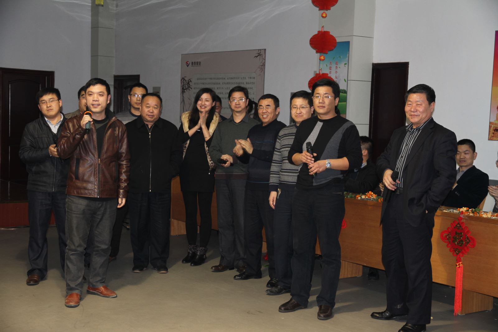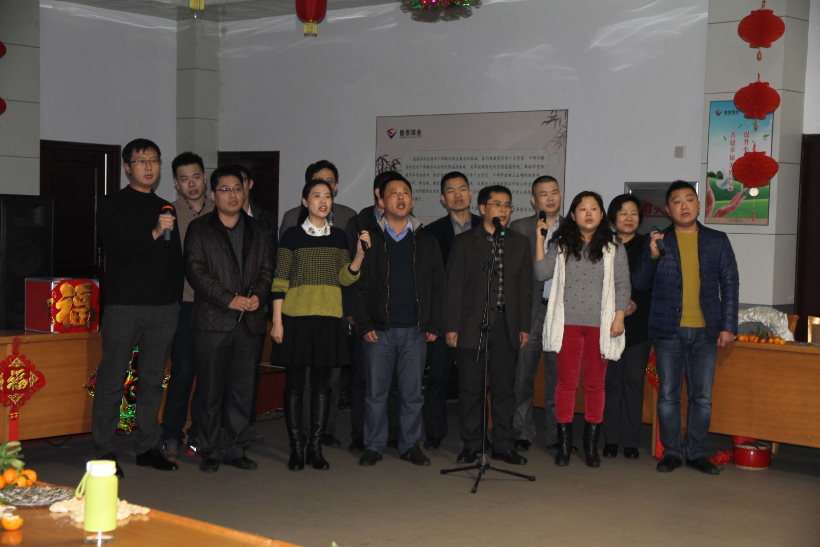 茶话会以充满喜庆祥和的歌曲《三羊开泰迎新春》拉开序幕,机关人员自导自演的三句半《巧用新字话鲁泰》、手风琴《鸿雁》和歌曲《中华民谣》《最真的梦》《为了这一天》《壮志在我胸》《想说爱你不容易》等深受好评,大合唱《相亲相爱一家人》、《团结就是力量》引起大家阵阵掌声。副总经理薛培华演唱的《千纸鹤》、副总经理关延忠参与的大合唱《众人划浆开大船》、副总经理王付清演唱的《甘心情愿》赢得了叫好连连。整台晚会营造了热烈喜庆、欢乐祥和、团结奋进、昂扬向上的良好氛围。游戏你演我猜、爱的组合,引得大家掌声、笑声此起彼伏,热闹非凡。游戏送祝福,更是表达了大家对公司、对机关人员新年的良好祝愿。