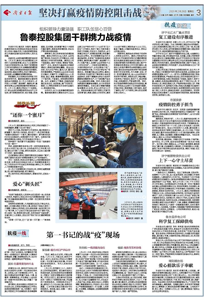 本报济宁讯(通讯员 张敬民)鲁泰控股集团党委充分发挥各级党组织的政治核心和战斗堡垒作用,为做好疫情防控各项工作提供坚强的组织和领导人员队伍保障。